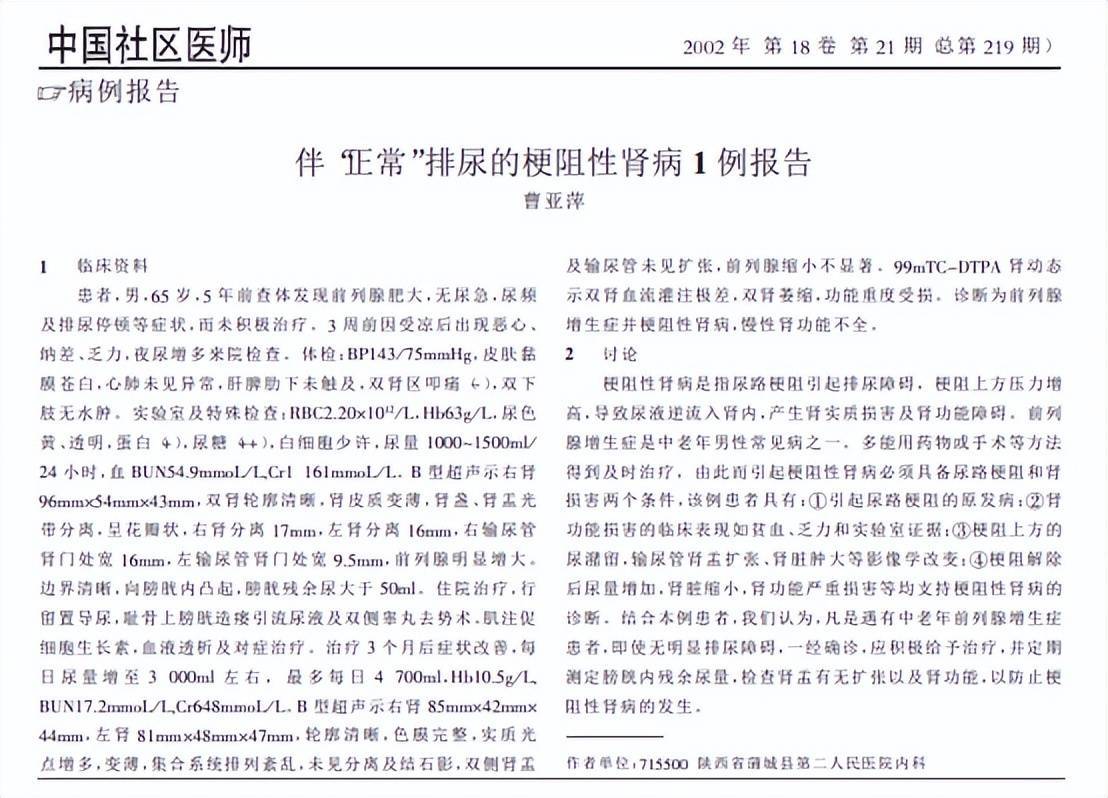 参考资料[1]曹亚萍.伴“正常”排尿的梗阻性肾病1例报告[J].中国社区医师,2002